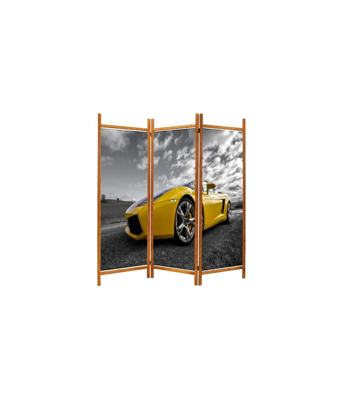 Rám paravánu  má drevenú konštrukciu a výplň je z potlačeného plátna- textílie.